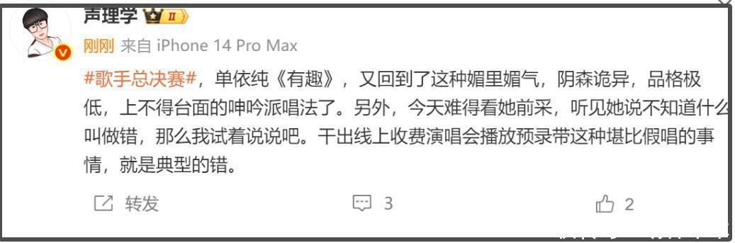 乐评人发文抨击,称她这首歌又回到了这种媚里媚气,阴森诡异,品格极低,上不得台面的呻吟派唱法了。还对她前采产生了很强烈的不满。单依纯采访称不知道什么叫做错,乐评人指出,干出线上收费演唱会播放预录带这种堪比假唱的事情,就是典型的错。也是很扎心了。
