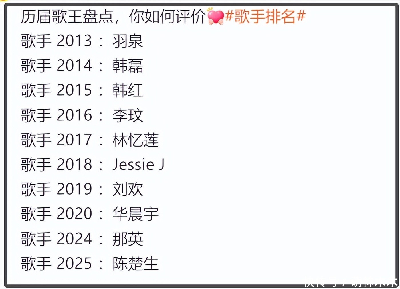 最后放上历届歌王名单,大家觉得陈楚生实至名归吗?